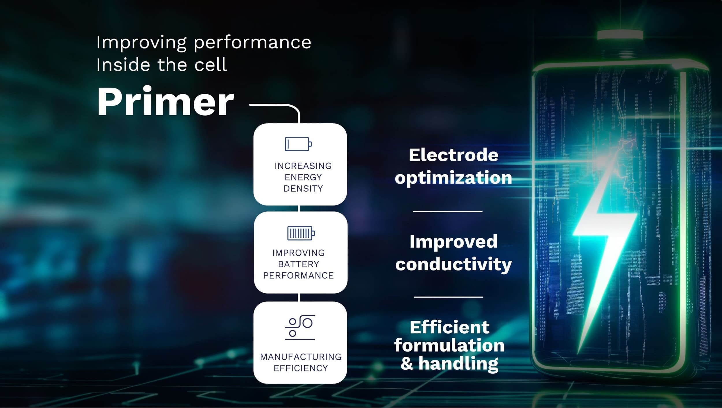 Primers play a critical role by forming a high-adhesion, conductive layer that ensures robust electrical connection and long-term electrode stability. Designed to address the key challenges of modern lithium-ion batteries, Incellion™ Pr enables more reliable electrodes, improved conductivity, and enhanced overall cell performance—supporting the next generation of EVs and high‑performance energy storage systems.