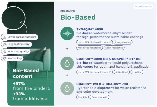 The result: premium interior coatings that combine excellent application, long-term durability, and superior aesthetic performance—while maximizing renewable content, improving indoor air quality, and lowering the overall carbon footprint.