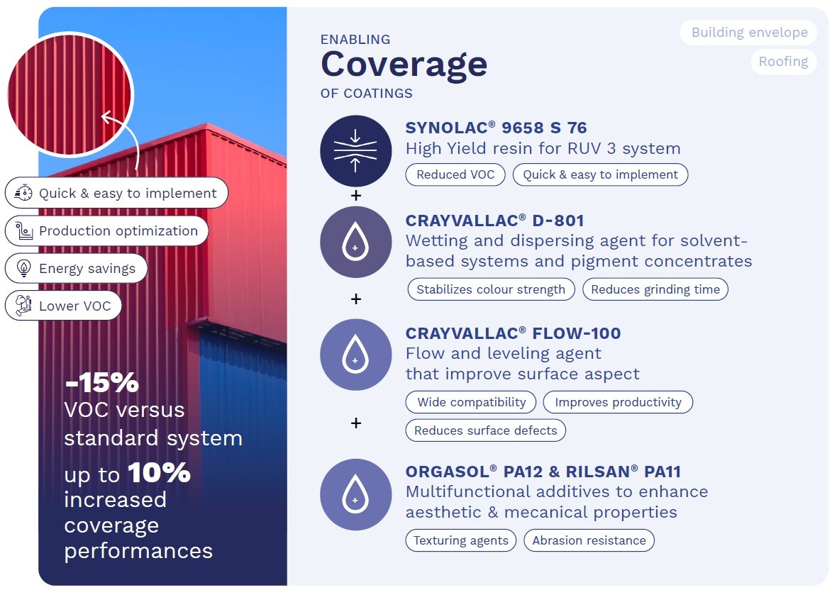 For coil coating applications, Arkema’s portfolio enables multiple combinations of complementary technologies to enhance coverage performance and sustainability outcomes. One example leverages SYNOLAC® 9658 S 76, a high-yield polyester resin that increases solids and film build, supported by selected additives to optimize wetting, leveling, and surface quality. Together, these synergistic solutions can deliver up to 10% higher coverage and 15% lower VOC, contributing to more efficient and sustainable production for roofing and building envelope applications.