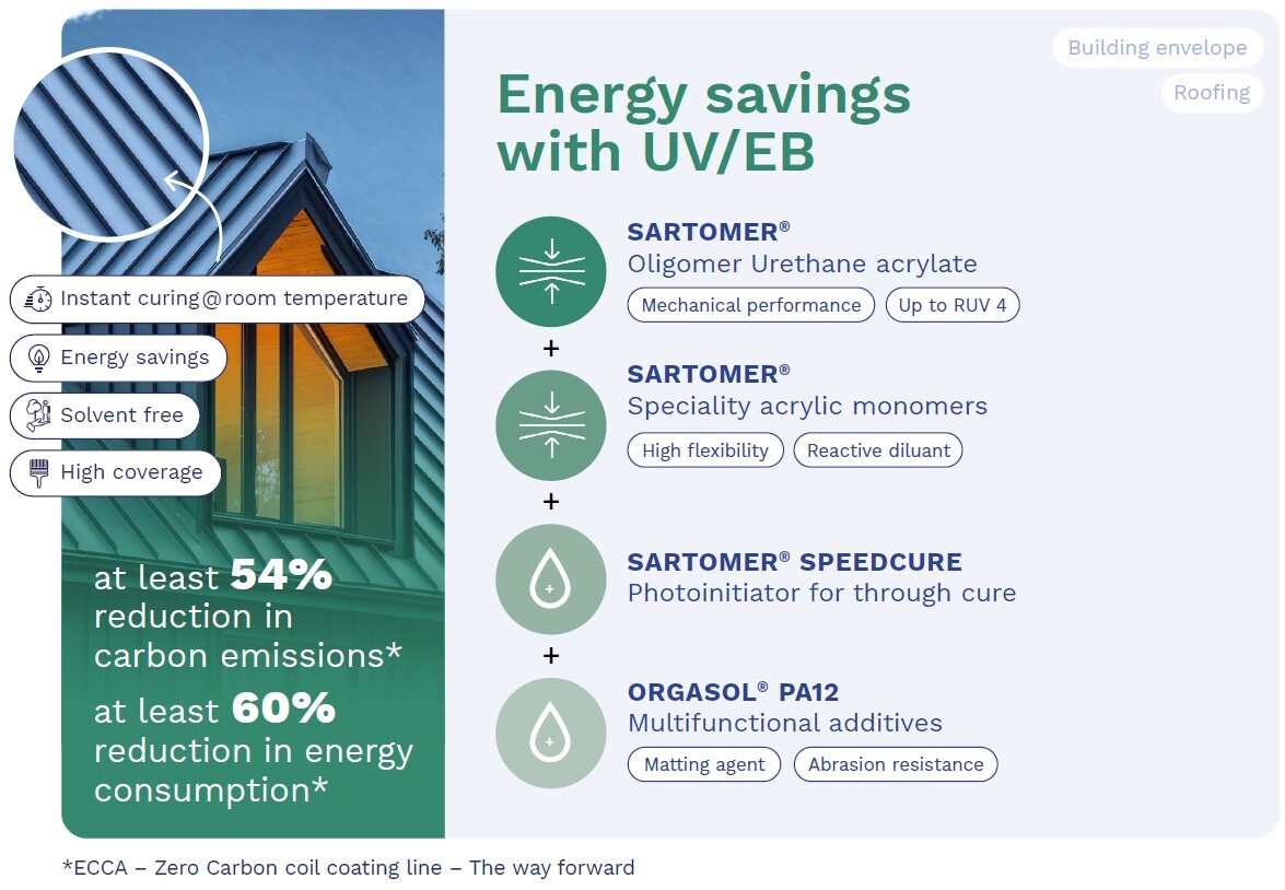 UV/EB curing technology offers coil coaters a disruptive pathway to reduce energy consumption and carbon emissions, while enabling solvent-free, high-coverage formulations that cure instantly at room temperature. One example combines Sartomer® UV-curable resins and reactive monomers, supported by photoinitiators to ensure through-cure and synergistic additives that enhance surface performance. This approach can deliver at least 60% energy savings and 54% reduction in carbon emissions compared to conventional thermal curing, supporting both production efficiency and sustainability objectives for architectural coil coatings.