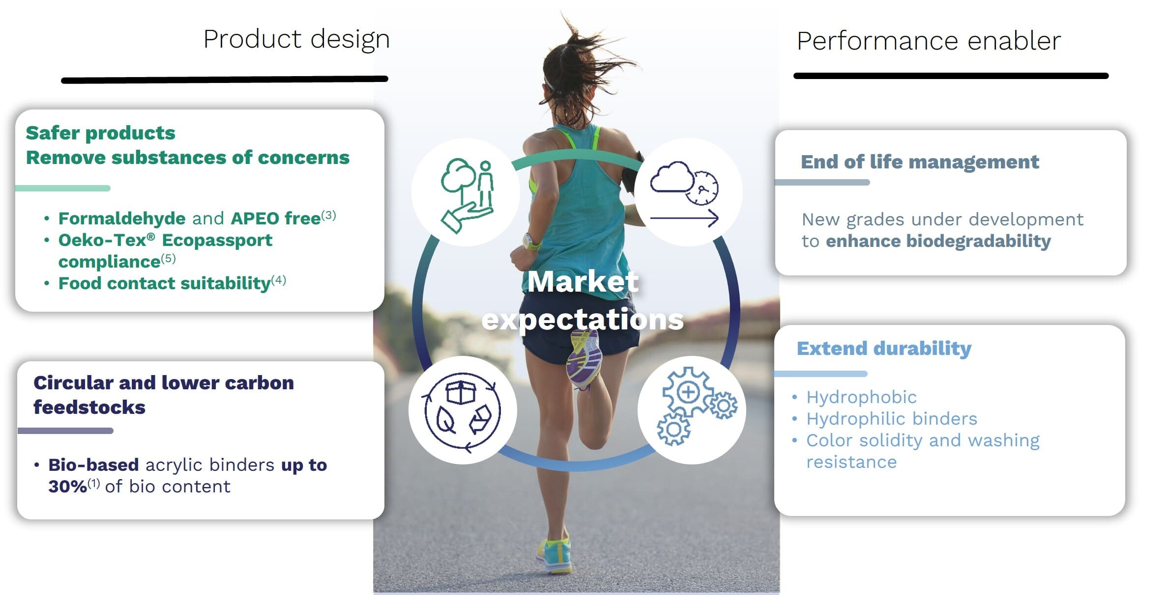Our polymers are APEO- and solvent-free. The range of Formaldehyde-free1 polymers can help you meet sustainable requirements and are ideal for technical textile applications.
