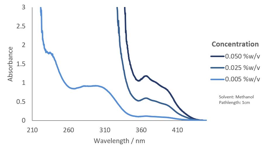 | Maxima Absorption Wavelength (nm) | 281, 365, 395 |