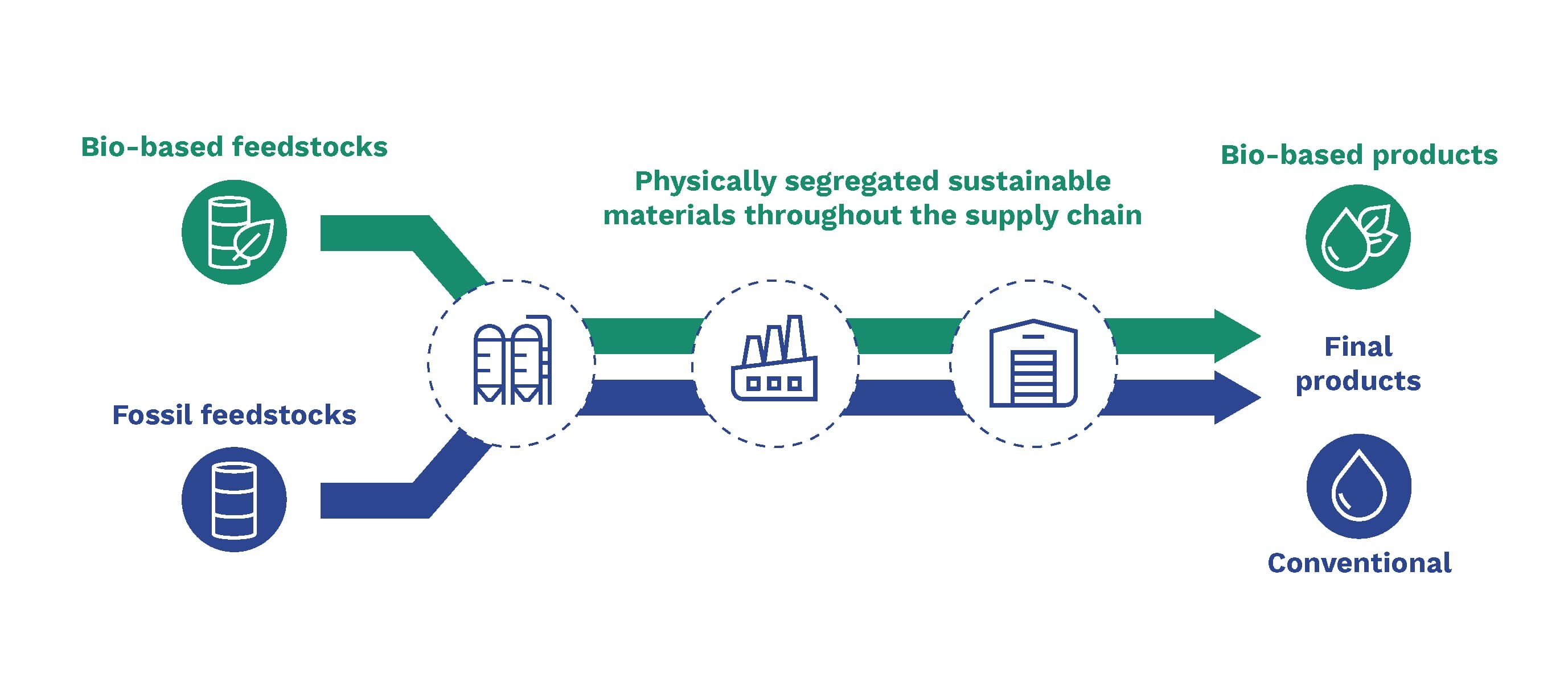 A segregated production is a production in which the bio-based materials are processed in segregated production lines. In this configuration, bio-based content can be measured by C14 analysis in final products.