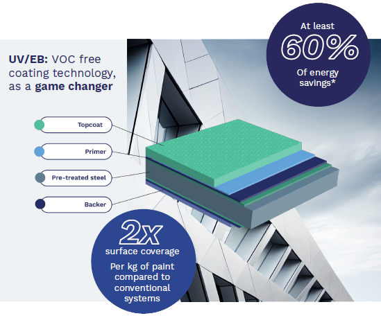 Arkema’s UV/EB curing solutions offer a breakthrough route to lower-energy coil coating systems, delivering up to 60% energy savings compared to conventional thermal curing while eliminating VOC emissions. With instant curing and up to 2× higher surface coverage per kilogram of paint, UV/EB enables productivity gains and reduced material usage. Arkema provides a comprehensive portfolio for UV/EB coil coatings—including urethane acrylates, reactive diluents, crosslinkers, photoinitiators and Orgasol® additives—supporting complete systems across primer, topcoat and backer applications.