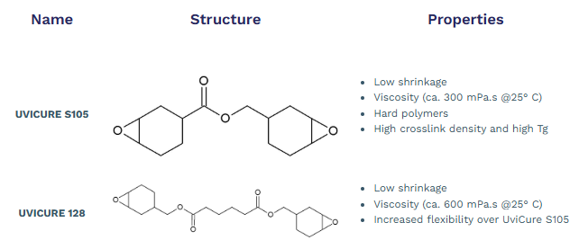 - Cycloaliphatic epoxy resins, available under the UviCure name.